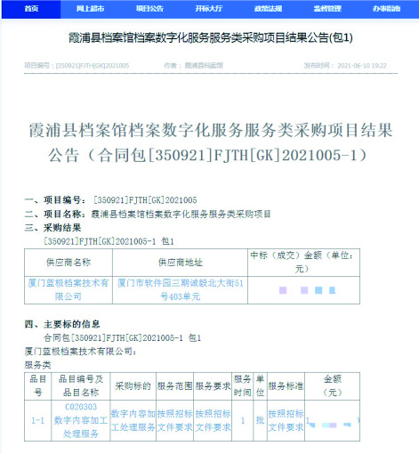 2021年6月10日公告,由福建省天海招標(biāo)有限公司組織的霞浦縣檔案館檔案數(shù)字化服務(wù)服務(wù)類采購項(xiàng)目正式公告,廈門藍(lán)極檔案技術(shù)有限公司參加該項(xiàng)目投標(biāo)活動,并成功中標(biāo)。
