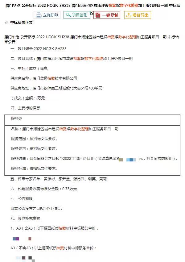 2022年4月13日公告,由廈門市華滄采購招標(biāo)有限公司組織的的廈門市海滄區(qū)城市建設(shè)檔案館數(shù)字化整理加工服務(wù)項(xiàng)目一期正式公告,廈門藍(lán)極檔案技術(shù)有限公司參與該項(xiàng)目投標(biāo)活動(dòng),并成功中標(biāo)!