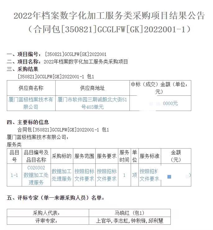 2022年4月20日公告,由福建杰成工程管理有限公司組織的長(zhǎng)汀縣檔案館2022年檔案數(shù)字化加工服務(wù)類(lèi)采購(gòu)項(xiàng)目正式公告,廈門(mén)藍(lán)極檔案技術(shù)有限公司參與該項(xiàng)目投標(biāo)活動(dòng),并成功中標(biāo)!