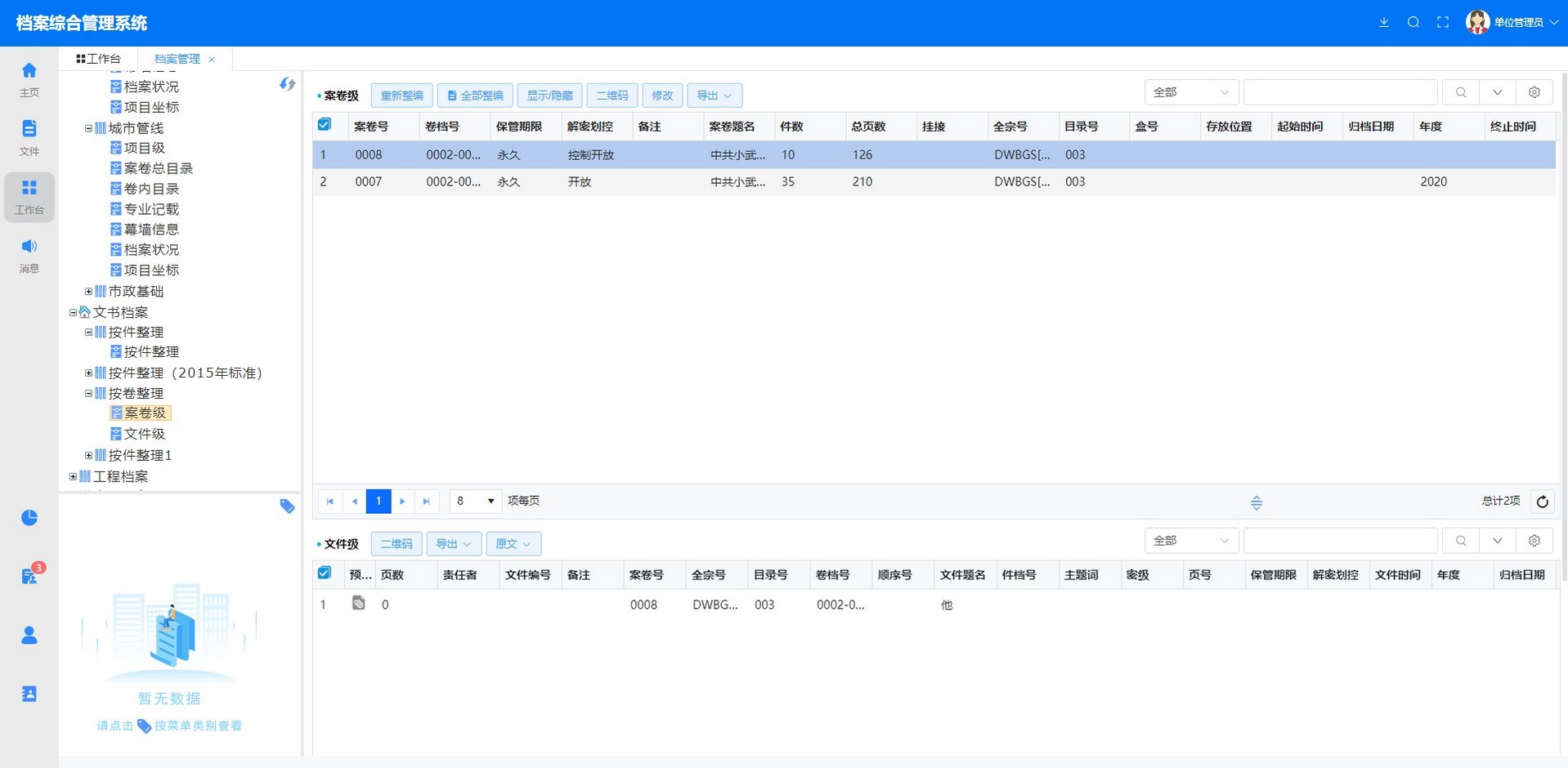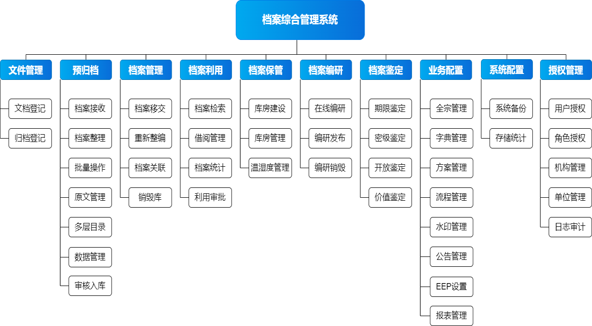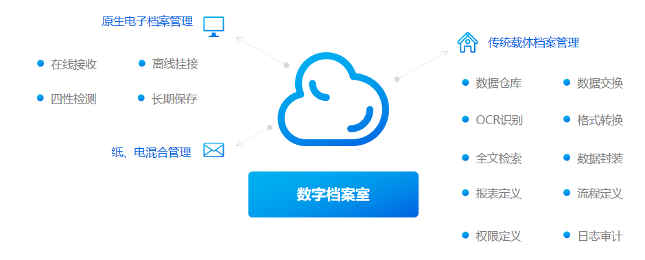 档案综合管理系统,能满足各类政企单位不同管理阶段需求,提供原生电子档案管理、传统载体档案管理和纸电混合管理的三位一体数字档案室整体解决方案。
