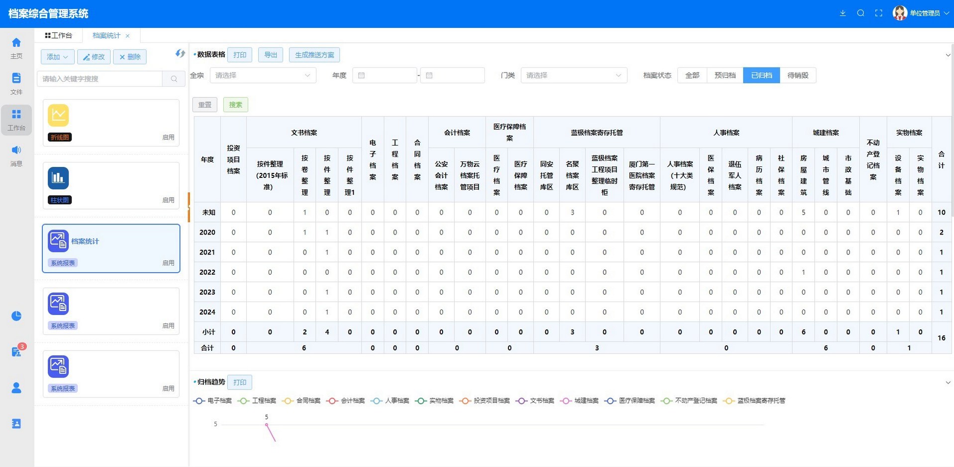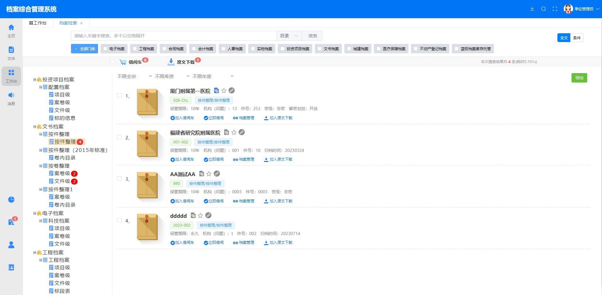 汇集了所有归档的数字档案,支持用户以不同的检索方式,快速筛选出所需档案,统计所需档案的记录,并辅助了借阅、导出等功能。