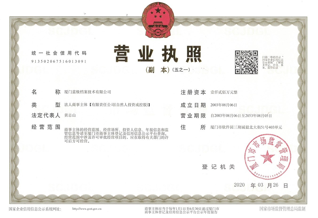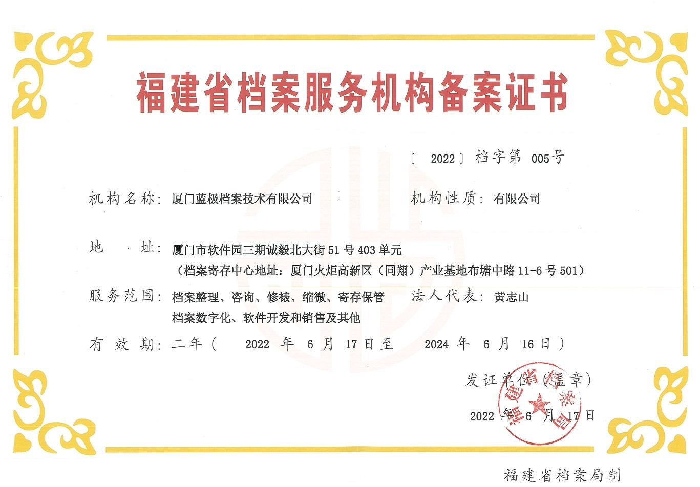 厦门蓝极档案技术有限公司成立于2003年8月6日,是厦门市最早从事档案技术服务、规模最大、综合实力最强的档案服务机构之一。